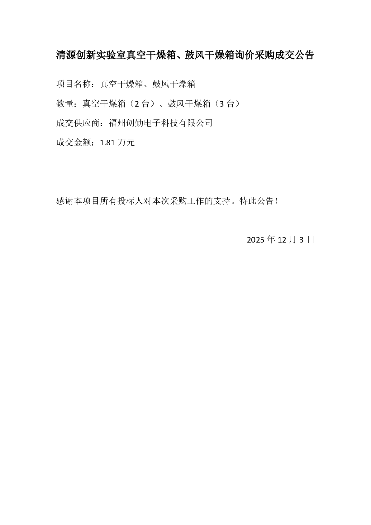 新得利(中国)真空干燥箱、鼓风干燥箱询价采购成交公告