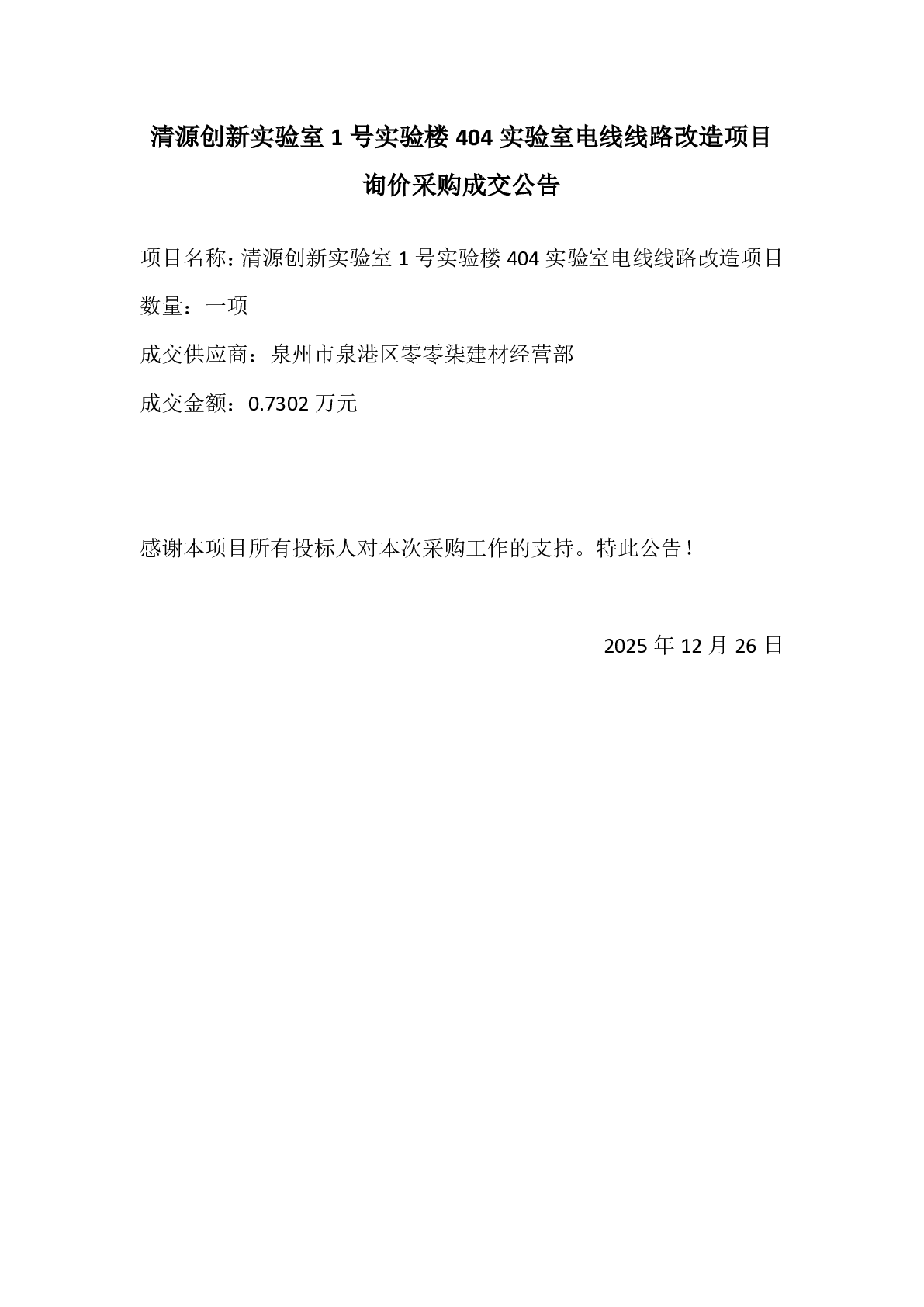 新得利(中国)1号实验楼404实验室电线线路改造项目询价采购成交公告