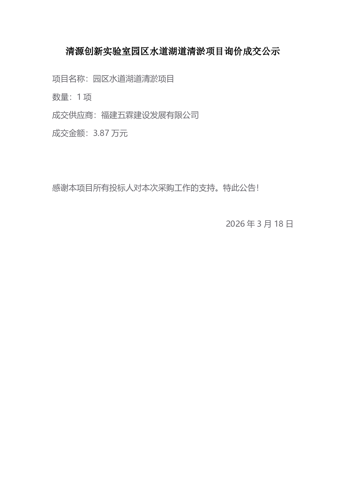 新得利(中国)园区水道湖道清淤项目询价成交公示