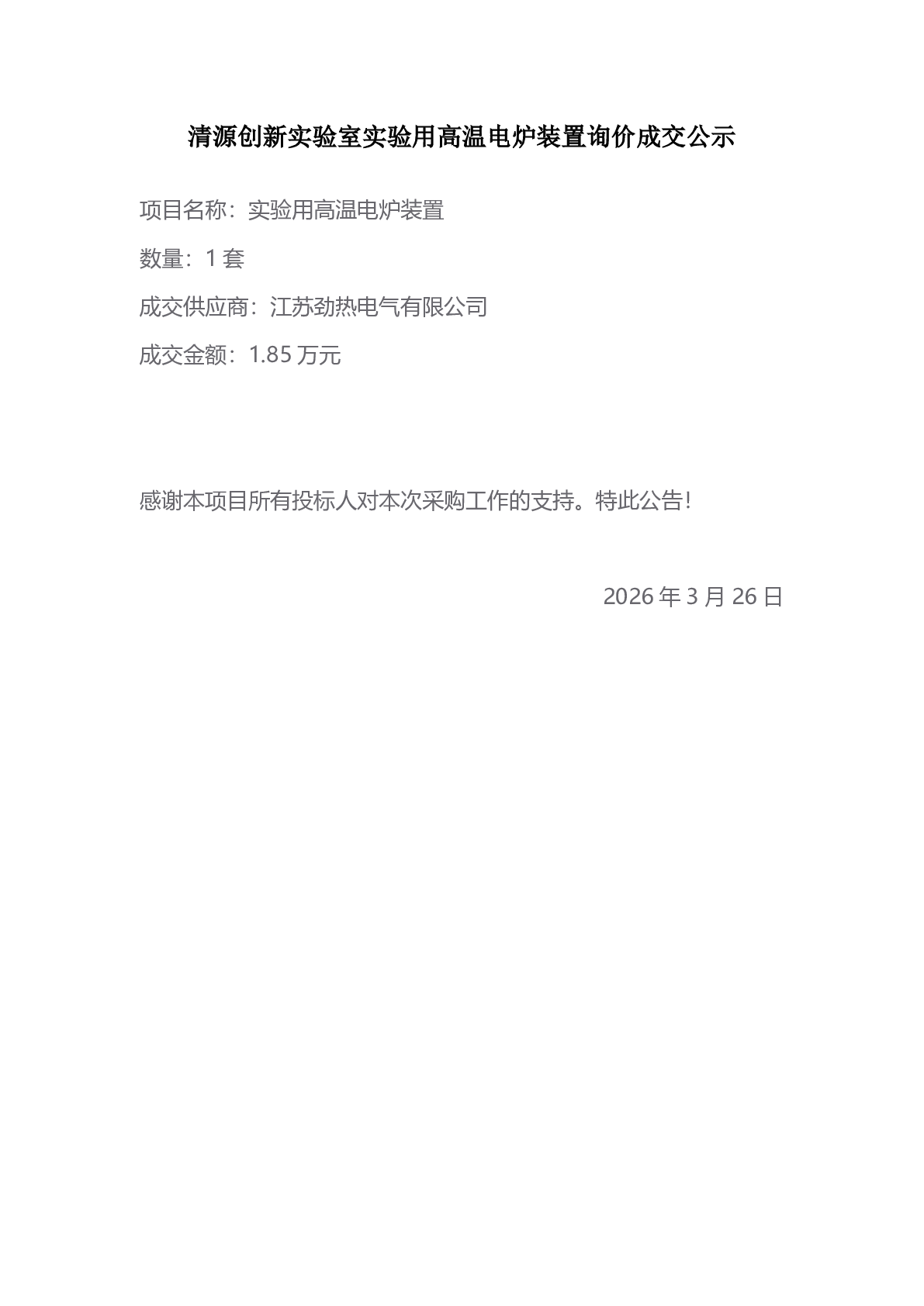新得利(中国)实验用高温电炉装置询价成交公示